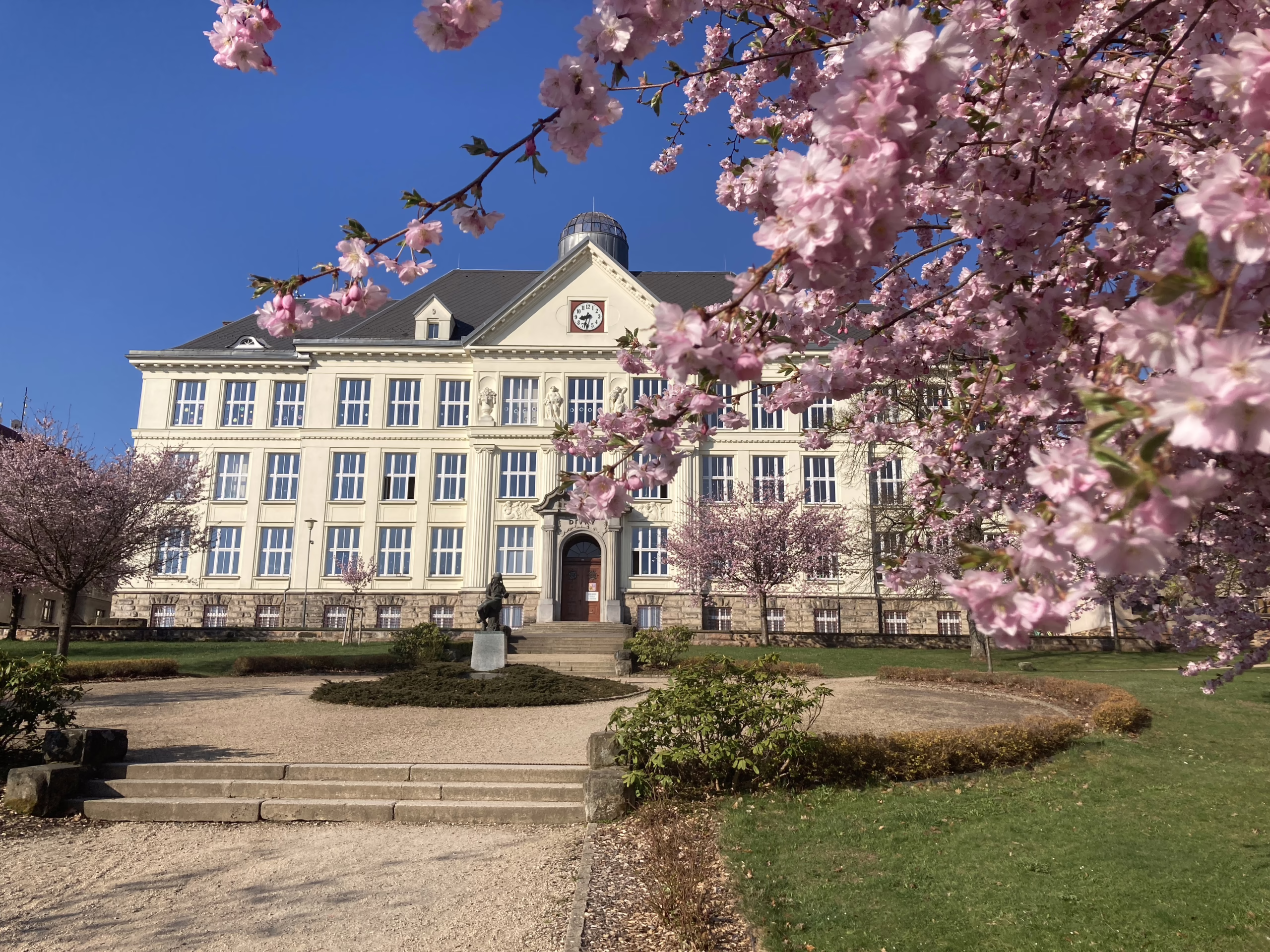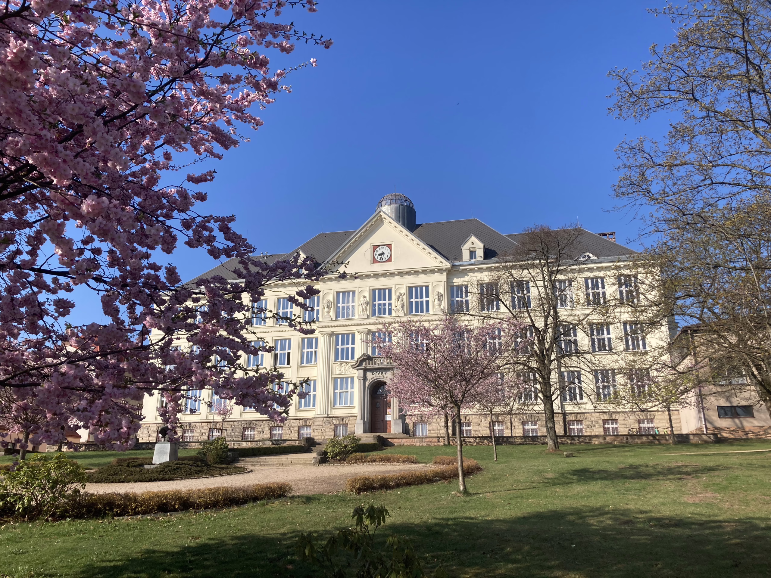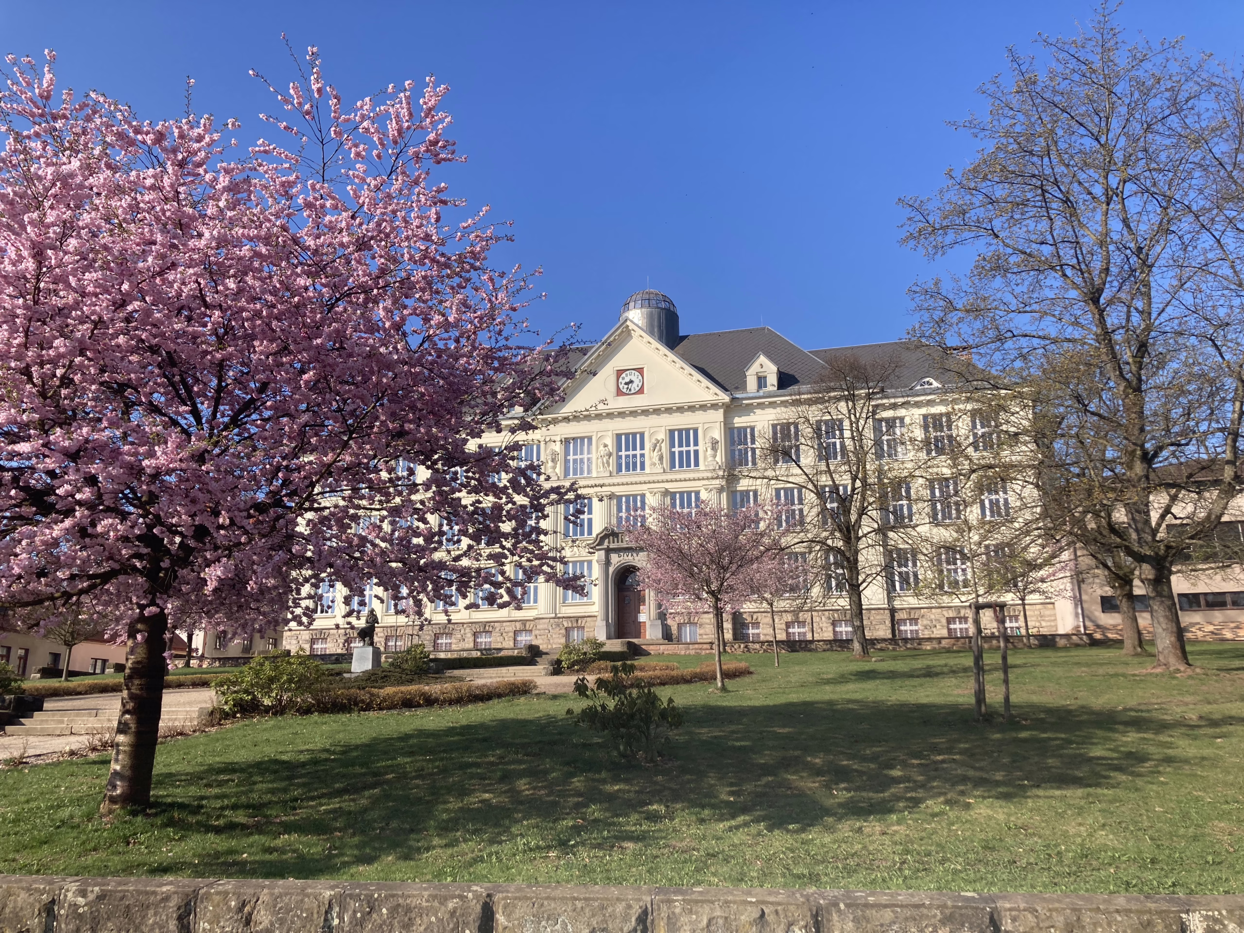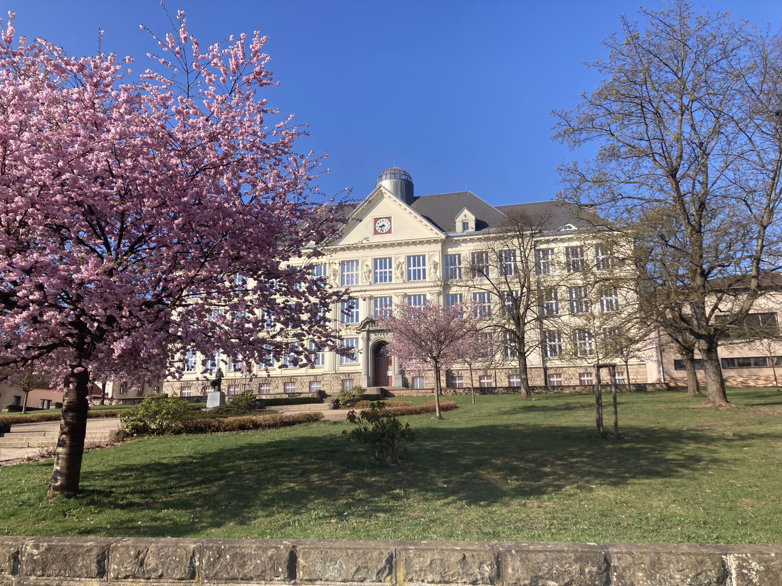 Rozkvetlé sakury v parku před školou