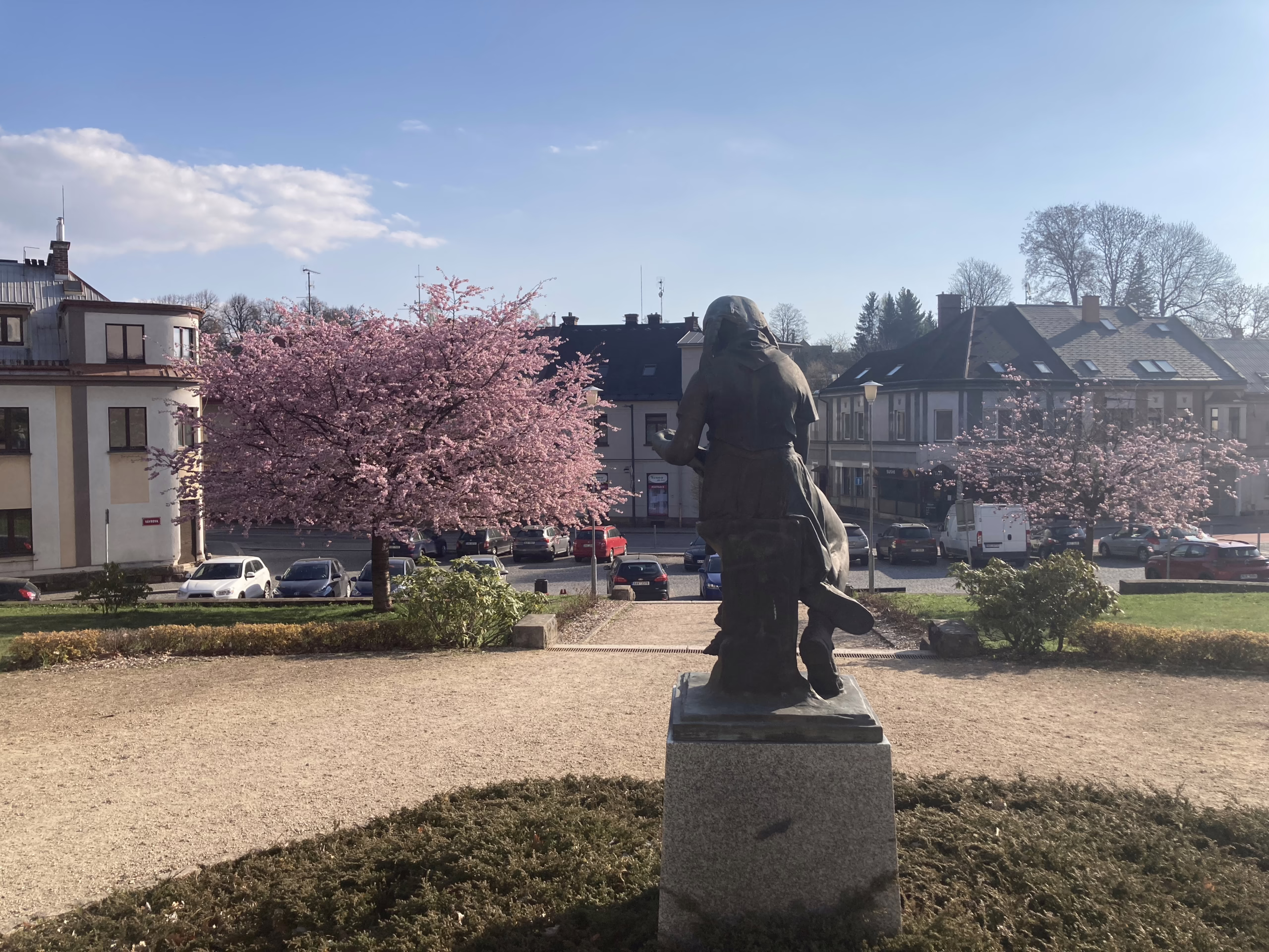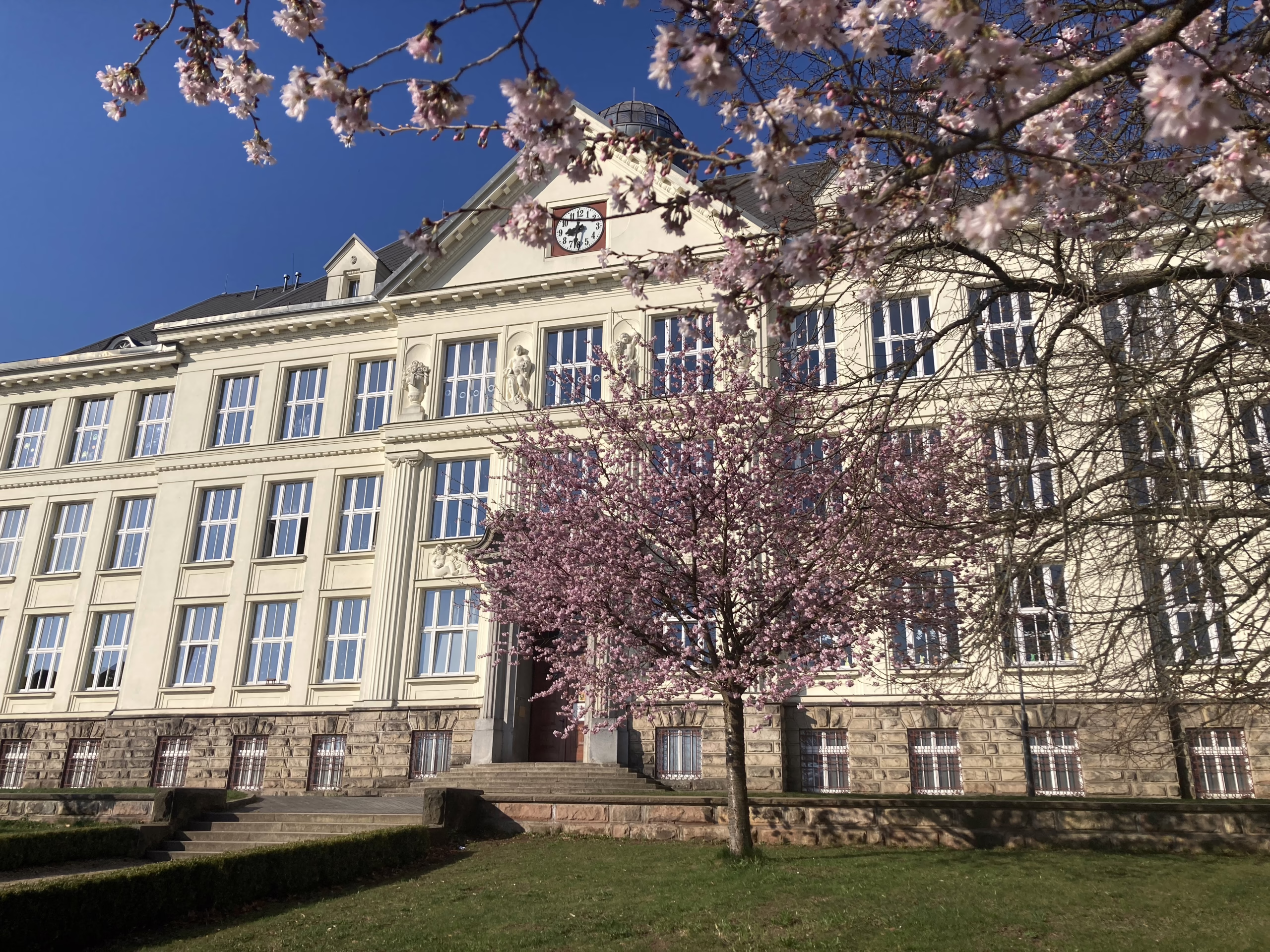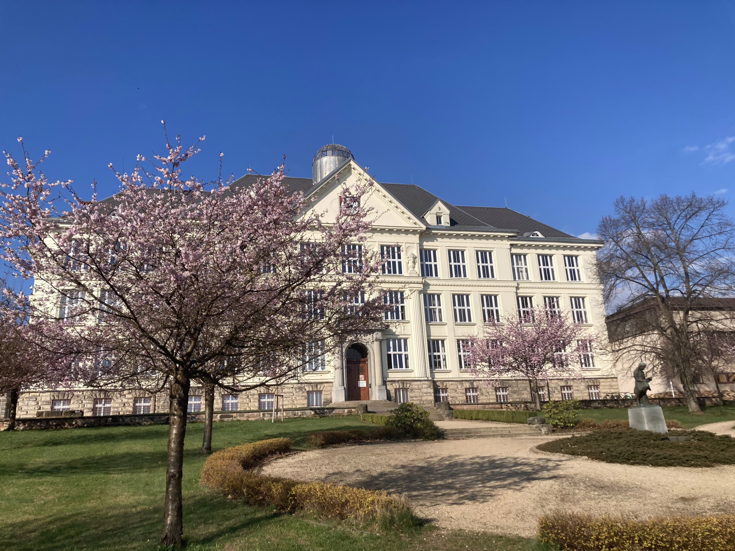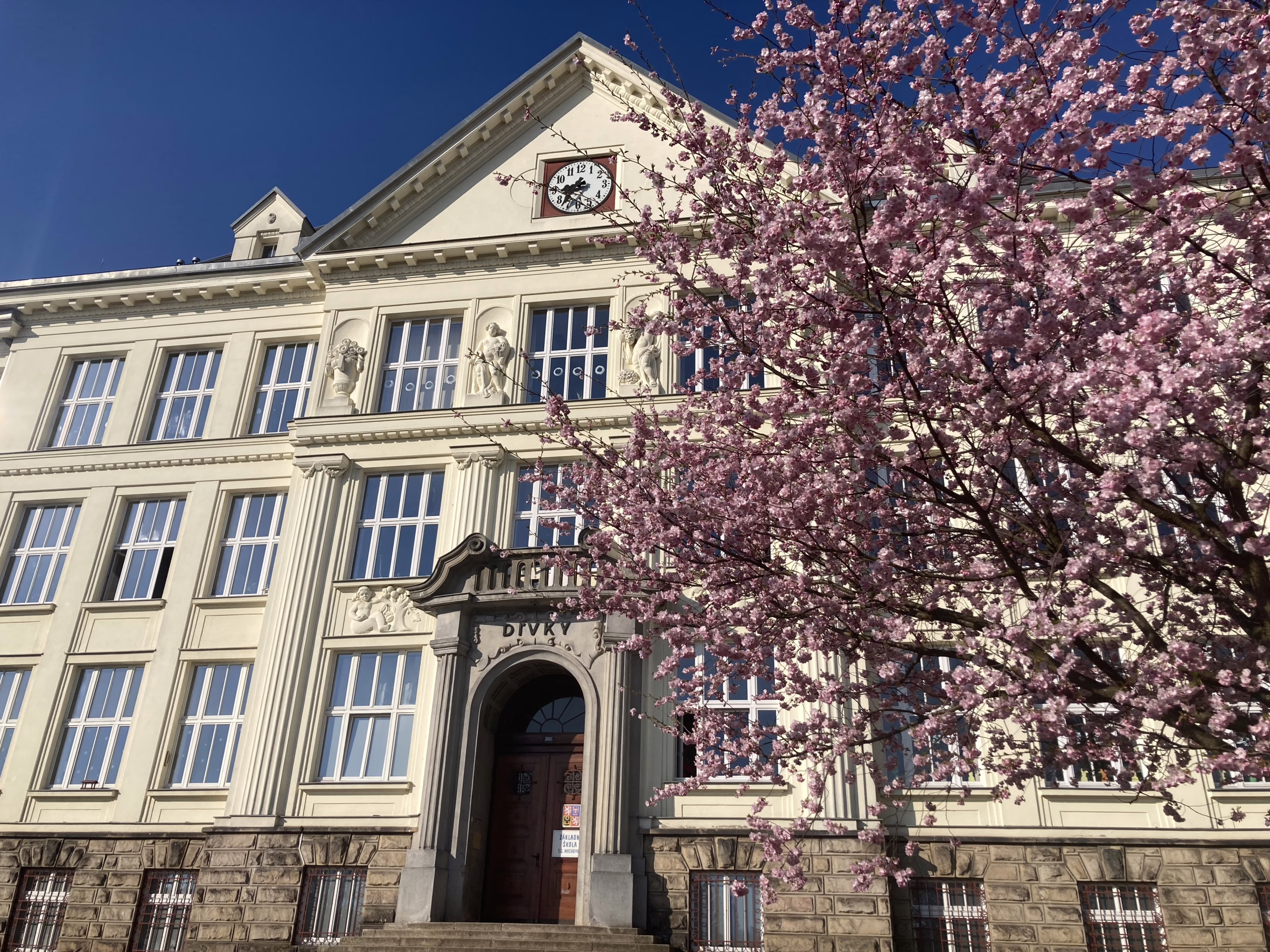 Rozkvetlé sakury v parku před školou