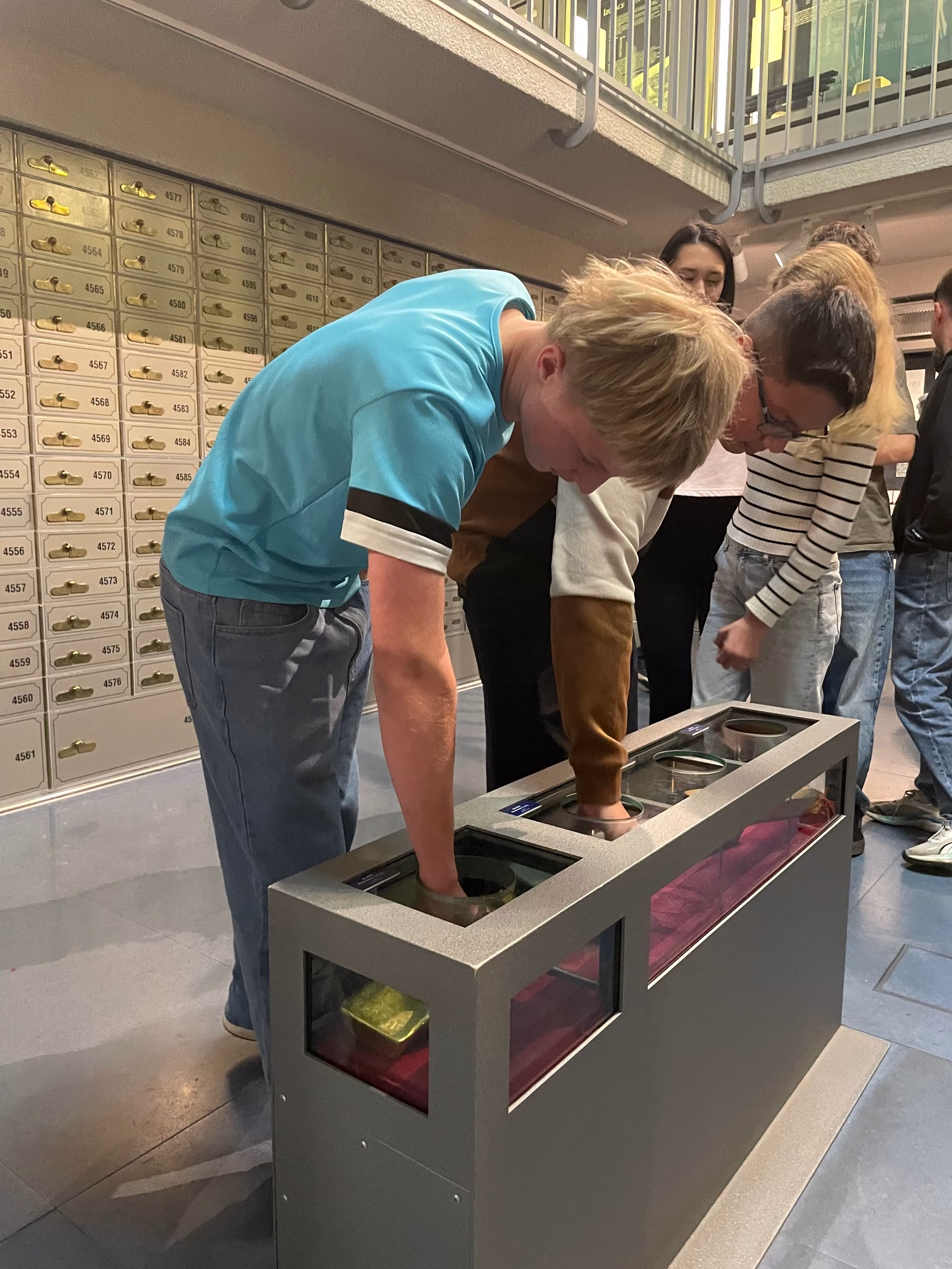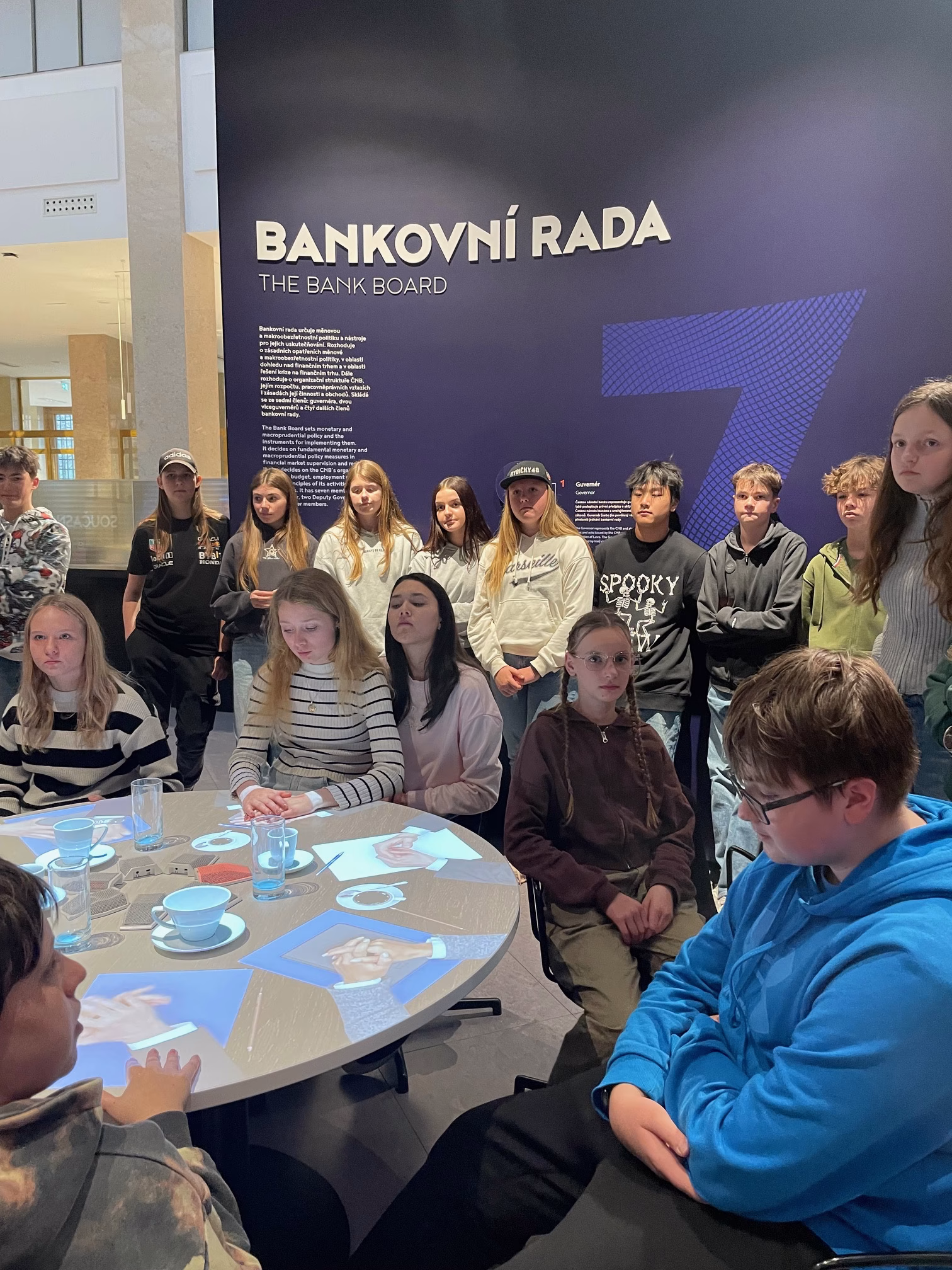 Již třetím rokem se kabinetu občanské výchovy daří uspořádat exkurzi do České národní banky a České tiskové kanceláře. Tentokrát se uskutečnila v pátek 14. listopadu Tato návštěva přinesla žákům 8. ročníků jedinečnou příležitost nahlédnout do zákulisí médií a světa financí. V ČTK se žáci dozvěděli, jak probíhá sběr, zpracování a distribuce zpráv. Seznámili se s historií této instituce a rolí, kterou hraje ve zpravodajství nejen v České republice. V ČNB si žáci prošli kombinovanou expozici „Lidé a peníze“ a “Za měnou”, kde se dozvěděli o historii české měny a fungování bank. Velkým zážitkem bylo nahlédnutí do trezoru se zlatou cihlou, kterou si mohli potěžkat. Zvládli jsme i procházku historickým centrem Prahy. Zastavili jsme se na Národní třídě,u památníku 17. listopadu a kde jsme zapálenými svíčkami zavzpomínali na význam onoho dne.